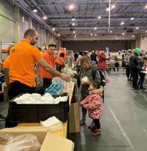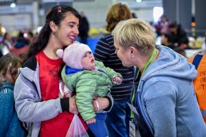 Segélyszervezetként mi a BOK-ban a menekültek étkeztetéséért és higiéniai ellátásáért, szükség esetén segélyezéséért vagyunk felelősek. A legtöbb átutazó nappal nálunk, az atlétikai csarnok közepén kordonokkal elkülönített étkezőben sorakozó asztalok körül várta az indulást vagy a találkozást, az estét vagy a reggelt. A hivatalos belépést követően a kormányhivatal munkatársaitól minden érkező kapott egy bónt, amellyel a segélyszervezetek pultjánál beszerezhette a tisztálkodáshoz vagy a gyermekek ellátásához szükséges legfontosabb eszközöket. Samponok, tusfürdők, kézfertőtlenítők, pelenkák, cumisüvegek, bébiételek, tisztasági betétek, papírzsebkendők százai várták és várják a menekülőket. Emlékszem azokra a májusi estékre, amikor a bőröndökkel érkező menekültek a hirtelen jött melegben a nyári ruházatot keresték, ahogy a júliusi éjszaka hűvösére is, amikor az édesanya valami melegebb ruházat után kutatott a gyereksarokban. Mert az az egyetlen bőrönd, ahová a menekülő hirtelen összekapkodta a legszükségesebbet oly keveset tudott csak befogadni abból, ami egy új élethez kellene. S ilyenkor olyan kincs lett mindaz, amit egy idegen segítő egy ismeretlen adományozó jóvoltából ajándékozhat. Sose felejtem el a heteken át bombázott donyecki régióból érkezett fiatal családot, ahol az édesanya egy-egy pár cipőt kért volna a kisgyerekeknek, hiszen csak az az egy volt nekik, amit épp viseltek. El se hittem, hogy a gyereksarok munkatársai épp aznap délután kaptak több tucat vadonatúj minőségi gyerekcipőt egy üzlettől – mindenféle méretben. Az az édesanya se hitte, aki kérdésemre, hogy miben segíthetek, bátortalanul osztotta meg a vágyát, nem hitte, hogy mint egy cipőboltban, úgy választhatja ki a gyerekek kedvére való lábbelit itt a tranzitváró kellős közepén. Együtt ez is lehetségessé vált. Együtt sikerült gondját viselni a ránk bízottaknak.